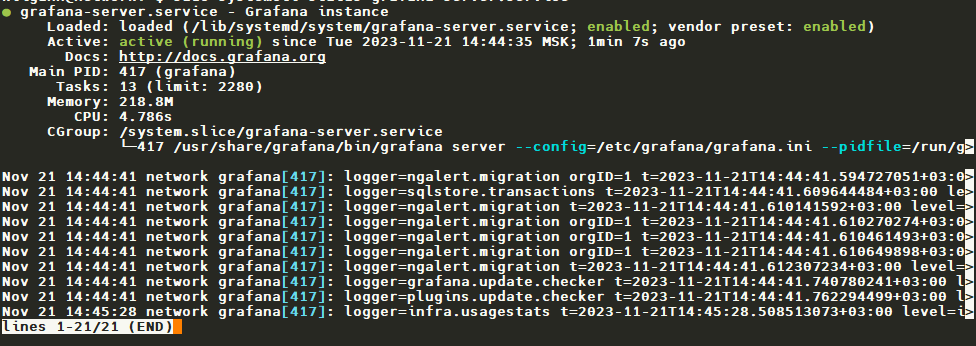 После установки пакета делаем sudo systemctl daemon-reload и sudo systemctl enable grafana-server.service и проверим статус sudo systemctl status grafana-server.service
